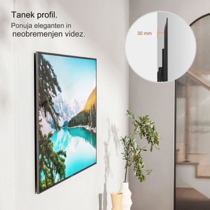Nosilec omogoča nagibanje naprej od 0 do 10°, ohranja ozek profil (3 cm) proti steni za urejen videz in podpira velikost zaslona od 37 do 82 palcev.