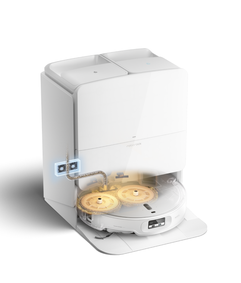 Enak sistem vroče vode se uporablja tudi za samodejno pranje dna postaje. S tem se odstranjujejo ostanki umazanije in preprečuje nastanek sluzi ali neprijetnih vonjav na območju, kjer robot parkira in pere krpe. Uporabnik mora osnovo le občasno ročno splakniti, večino dela pa opravi avtomatika.