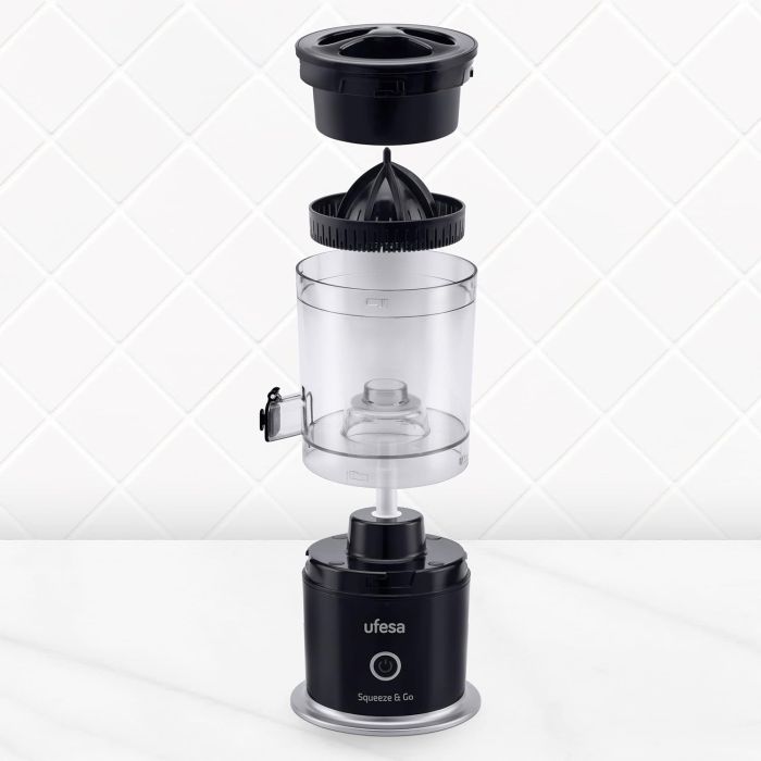 Elegantna zasnova. Elegantno in hkrati sodobno obliko sokovnika Ufesa Squeeze & Go poudarjajo prozorni deli naprave, zaradi katerih je sok med stiskanjem viden. Črni deli naprave dodajajo eleganco in jo naredijo za popoln pripomoček, ki ga lahko vzamete s seboj, kamor koli greste.
