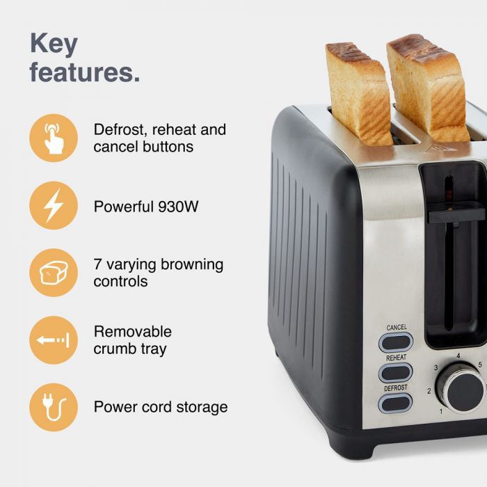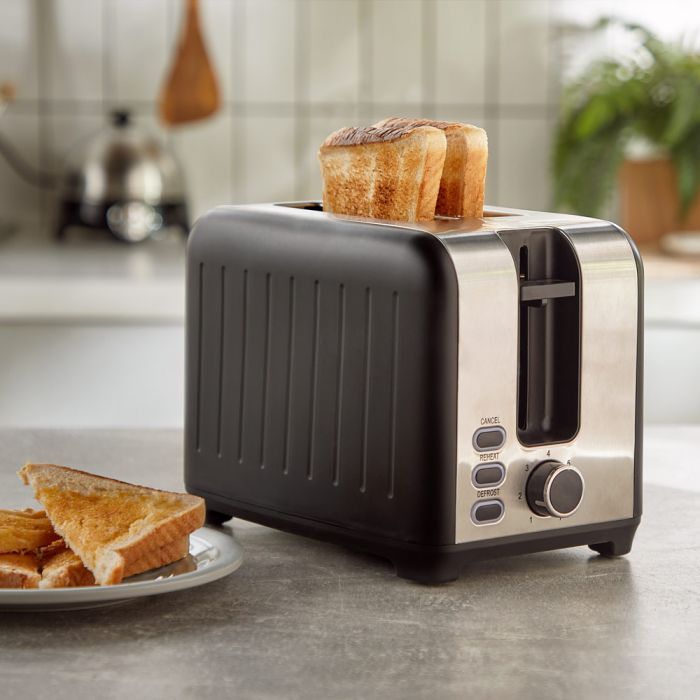 - Eleganten toaster z dvema 120 x 130 mm režama in preprostimi upravljalniki.