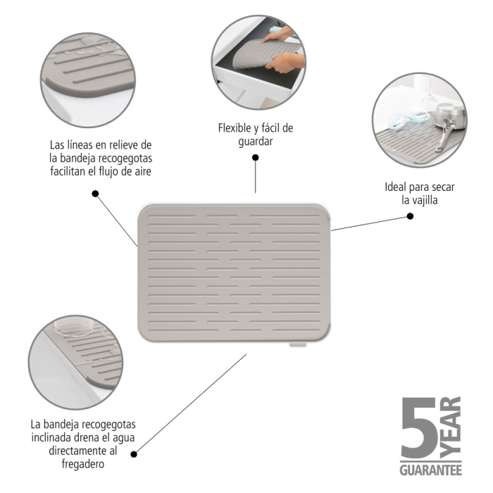 Narejena iz mehkega, nedrsečega silikona – primerna za posodo, skodelice in celo krhko steklovino. Voda iz posod teče neposredno v umivalnik – vaša delovna plošča ostane suha.Prednosti in lastnosti Idealno za vsa mala opravila pri pomivanju posode. Izdelana iz trpežnega silikona – enostavna za čiščenje in enostavno pranje v pomivalnem stroju varna. 5-letna garancija in servis.