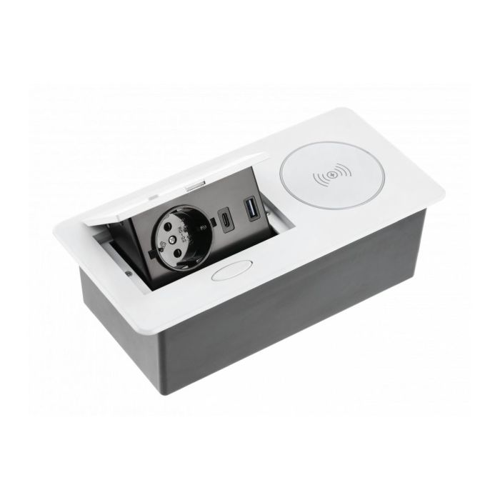 Sodobna vgradna vtičnica primerna za vse vrste površin na kuhinjskem pultu ali na pisalni mizi v pisarni.