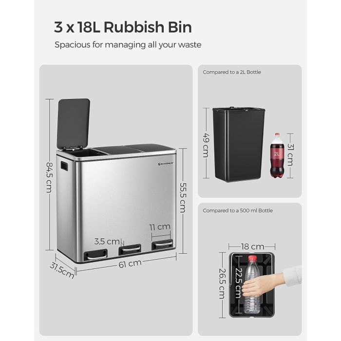 Kaj dobite: Črn koš za smeti s 3 predali x 18 l, priročnimi pedali in odstranljivimi notranjimi vedri za enostavno odstranjevanje odpadkov in brezskrbno recikliranje.
