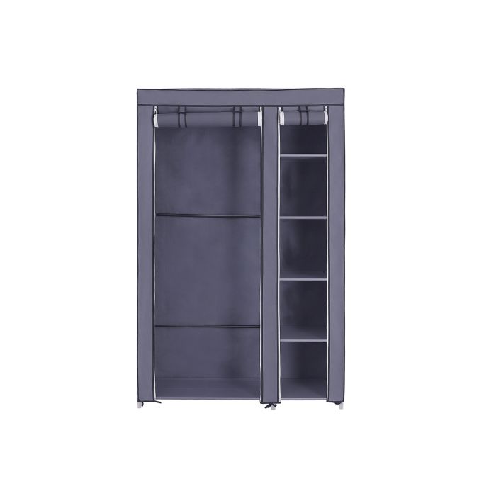 Kaj lahko naredi za vas? Oglejte si to omaro: jasno strukturirana enota z obešalno palico in spodnjo polico na eni strani, 5 policami na drugi strani ter prevleko iz sive tkanine, ki poskrbi, da so tako daljše obleke kot zložena oblačila skrita in zaščitena pred prahom.