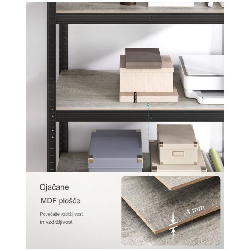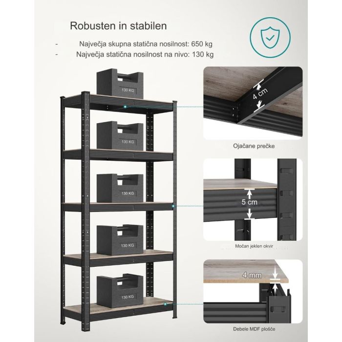 Podrobnosti o izdelku:Barva: naravna črnaMaterial: prašno lakirano jeklo, MDF (vlaknena plošča srednje gostote)Velikost posamezne police: 150 x 75 x 30 cm (v x d x š)Teža posamezne police: 8,1 kgMaksimalna statična nosilnost posamezne police: 80 kg
