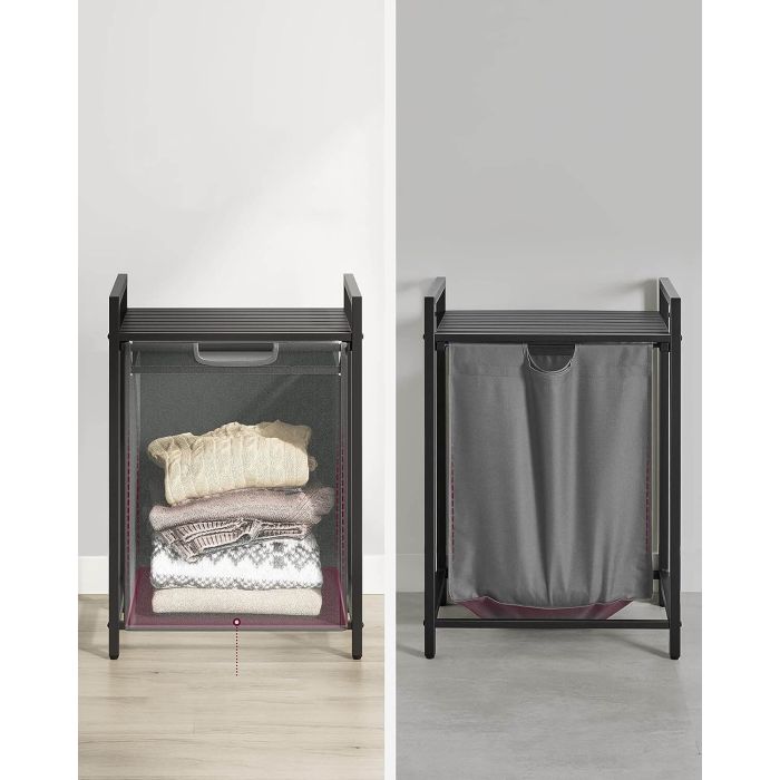 Letvena polica za shranjevanje: ta košara za perilo ima polico, ki zagotavlja dodaten prostor za organiziranje detergentov ali toaletnih potrebščin. Njegova zasnova z letvicami omogoča pretok zraka za dobro prezračevanje in preprečuje nabiranje vonjav v perilu.