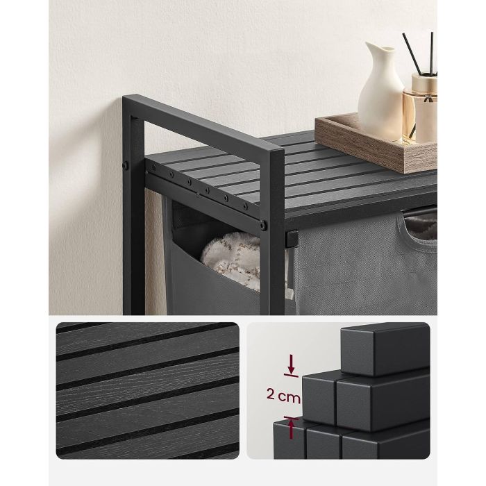 Trdna in stabilna: izdelana iz okvirja iz 2 cm jeklene cevi in plošče iz MDF, podpira do 20 kg na zgornji polici. Poleg tega je košara izdelana iz vodoodbojne tkanine Oxford, štiri nastavljive noge pa zagotavljajo stabilnost
