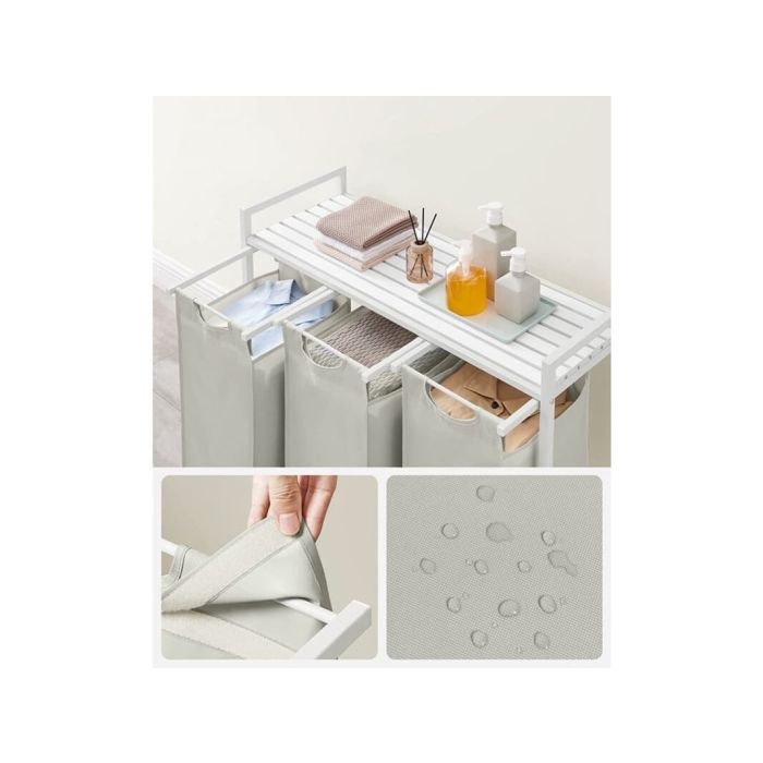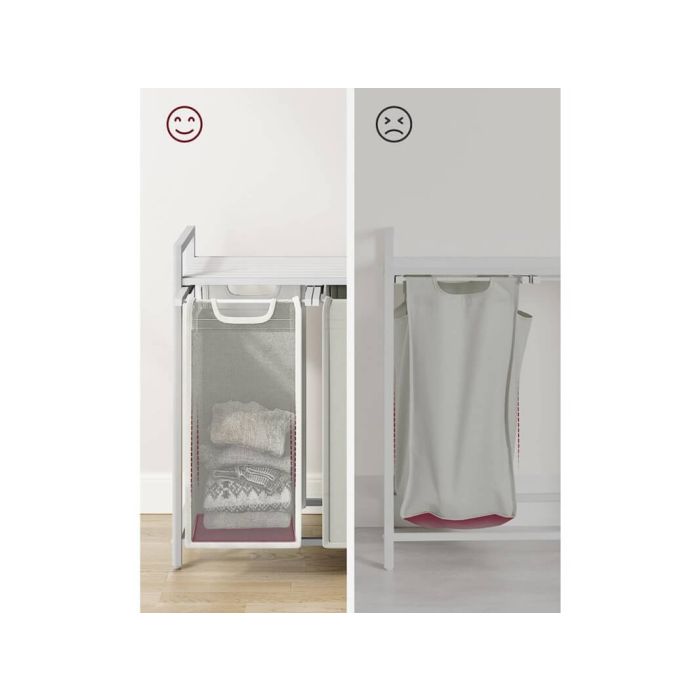 3 predelki za ločeno shranjevanje: koš za perilo ima skupno prostornino 114 L, pri čemer ima vsaka košara prostornino 38 L. Njena zasnova s 3 predelki vam omogoča, da perilo organizirate po vrsti in ločite svetlo perilo od temnega.