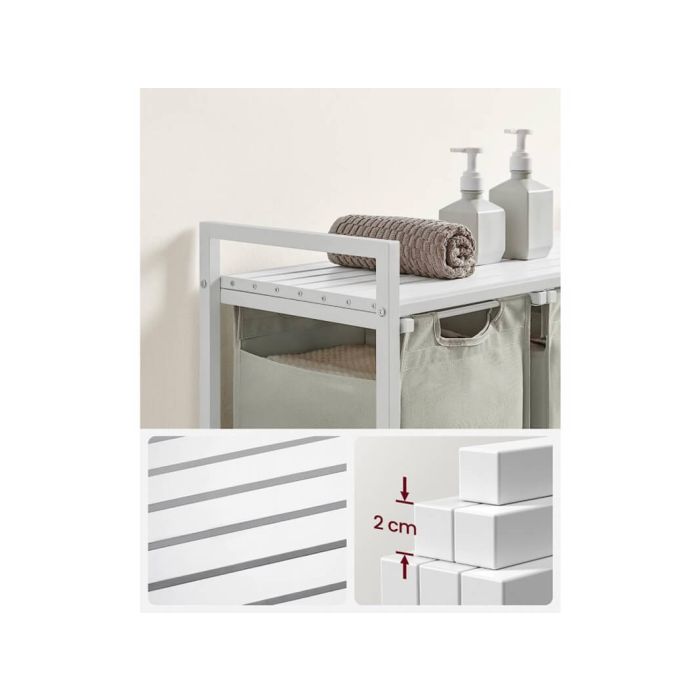 Trdna in stabilna: ta košara za perilo, izdelana iz okvirja iz 2 cm jeklene cevi in plošče iz MDF, podpira do 20 kg na zgornji polici. Poleg tega je vsaka košara izdelana iz vodoodbojne tkanine Oxford, štiri nastavljive noge pa zagotavljajo stabilnost.