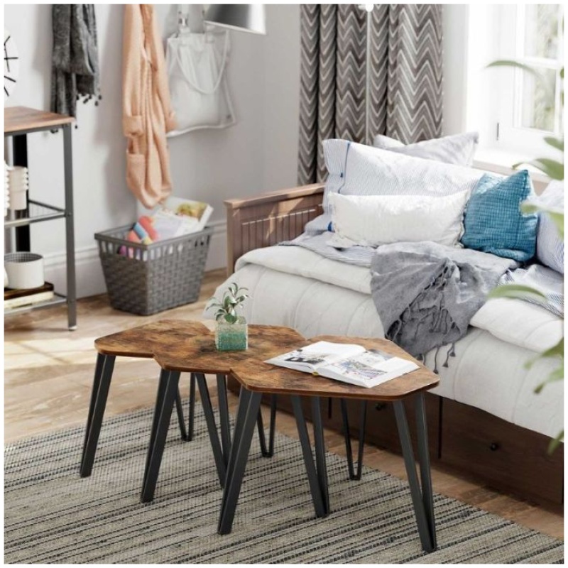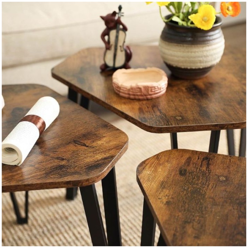 RUSTIKALEN ČAR: Rustikalni rjavi leseni vrhovi izžarevajo pridih klasičnega sloga iz starih časov, togi jekleni okvirji pa dajejo industrijski pridih. Zdaj se združujejo v tem kompletu miz, ki v vaš dom prinašajo pozitivne vibracije.