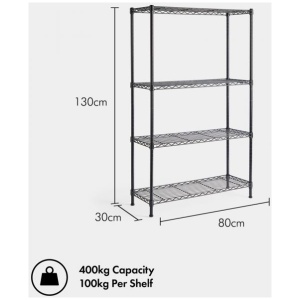 Izdelana iz jekla, odpornega proti praskam, ima vsaka polica nosilnost 100 kg in prezračevano zasnovo za lažje čiščenje.