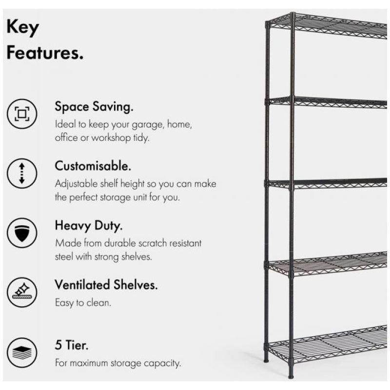 Izkoristite svoj domači prostor in lepo organizirajte svojo delavnico, domačo pisarno ali garažo z našimi 5-stopenjskimi žičnimi policami.