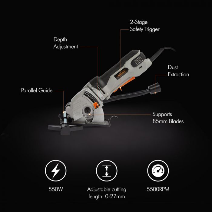 Vzdržljiv motor z močjo 550 W omogoča vrtenje večnamenske žage pri hitrostih do 5500 vrt/min za enostavno rezanje različnih materialov, kot so vezane plošče, iverne plošče, masivni les, ploščice in aluminij.