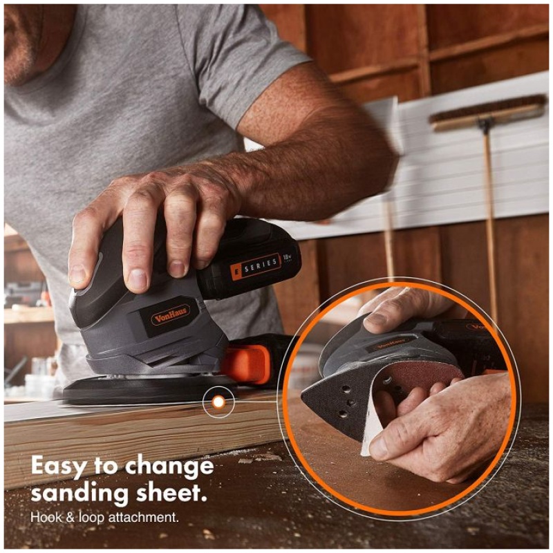 Vibracijski brusilnik VonHaus je priročno orodje za uporabo na lesu, plastiki in kovini. Zaradi svoje majhne, trikotne oblike je idealen pomočnik pri delu na nerodnih mestih. Mehak, gumiran ročaj omogoča trden oprijem in upravljanje.