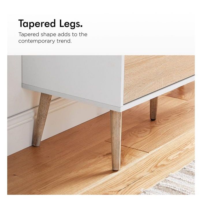 VonHaus Koto manjša TV omarica je lahko tudi samostojna omarica za shranjevanje. Skandinavski dizajn, visokih, stožčastih nog ujemajočega hrastovega zaključka pa jo naredi še posebej moderno. Za shranjevanje so vam na voljo odprt zgornji del z dvema policama in dva predala z domiselnimi ročaji.