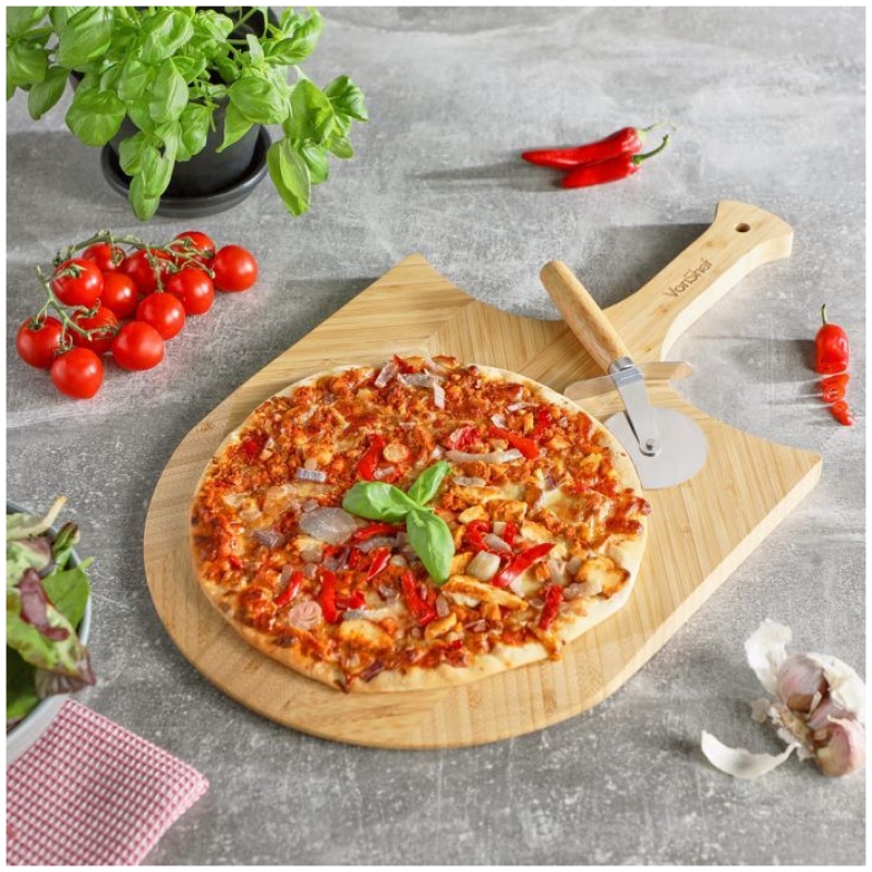 Pripeljite picerijo domov z našim elegantno bambusevo desko za pico in visokokakovostnim rezalnikom za pico iz nerjavečega jekla.