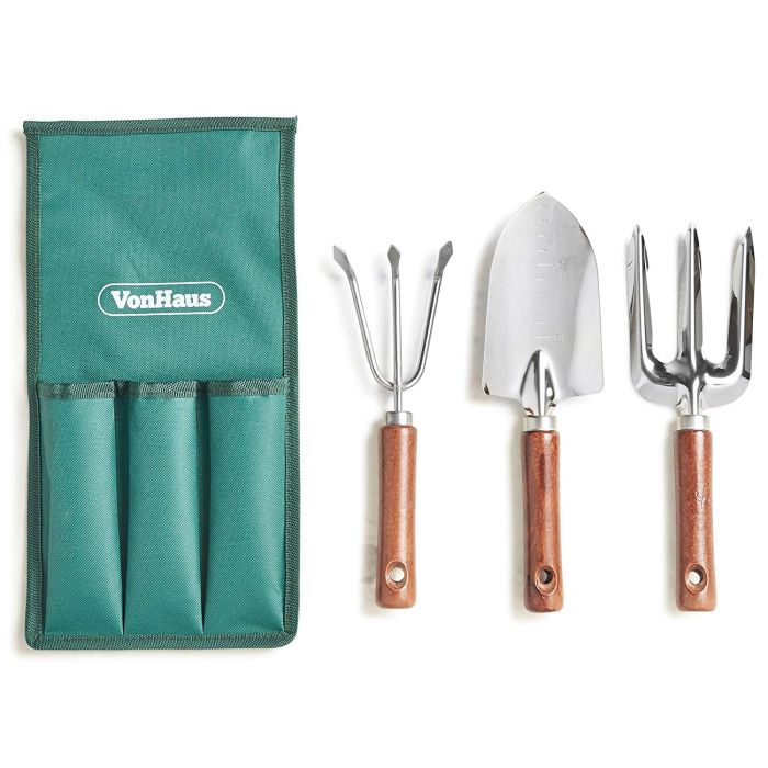 - Komplet orodja vključuje lopatica za sajenje, vilice, grablje in vrečko za shranjevanje orodja, tako da lahko takoj preidete na delo
