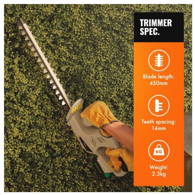 - S hitrim, 45-cm lasersko rezanim rezilom, ki deluje s hitrostjo 1.400 vrt / min, olajša vsa vaša vrtnarska opravila.