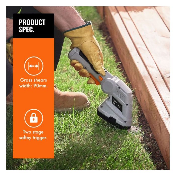 - Zasnova 2 v 1 vam omogoča pretvorbo med ročnimi škarjami za živo mejo in funkcijami pokončnega striženja trave s podaljškom