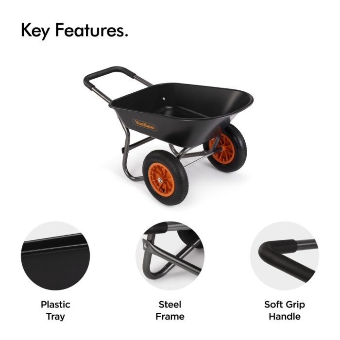 - Napihljiva dvojna kolesa omogočajo stabilnost nad grobo podlago, mehki ročaji pa omogočajo udobno držanje, zaradi česar je pri dvigovanje in prenašanje vrtnega materiala bolj enostavno.