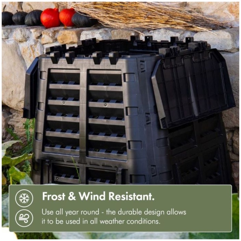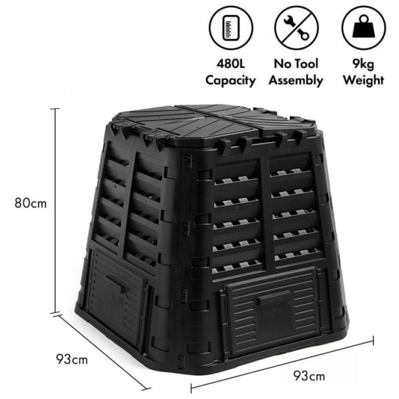 Kompostiranje ne le da zmanjšuje vaš ogljični odtis, ampak tudi koristi vašemu vrtu z obogatitvijo zemlje ter pomaga pri preprečevanju bolezni in škodljivcev rastlin.To je rešitev, ki koristi vam in planetu, z našimi kompostniki pa je to enostavnejše kot kdaj koli prej.S hitrim sestavljanjem, letvasto zasnovo za vgrajeno prezračevanje ter pokrovom za zbiranje deževnice za namakanje, je ta 360-litrski črni kompostnik idealen za zmanjšanje odpadkov. Je odporen proti zmrzali in opremljen z varnimi sidri za tla, kar zagotavlja vzdržljivost in stabilnost v vseh letnih časih.Dimenzije: Višina 80 cm x Širina 93 cm x Globina 93 cm Kapaciteta: 480 L Barva: Črna Teža: 9 kgTa izdelek zahteva samostojno sestavljanje, vendar so naša navodila hitra in enostavna za sledenje.