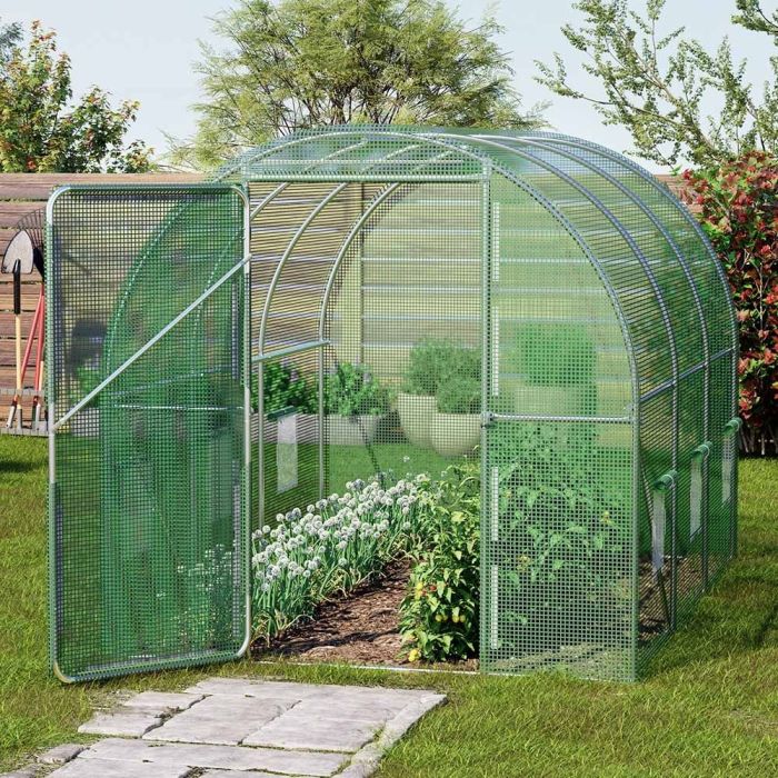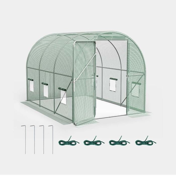 Za razliko od klasičnih rastlinjakov z zadrgami ima ta polytunnel trdna vrata na tečajih, ki omogočajo lažji dostop do rastlin brez zapletenega odpiranja. Šest zložljivih mrežnih oken omogoča nadzor pretoka zraka, zmanjševanje vlage in zaščito pred škodljivci, hkrati pa zagotavlja učinkovito prezračevanje rastlinjaka.