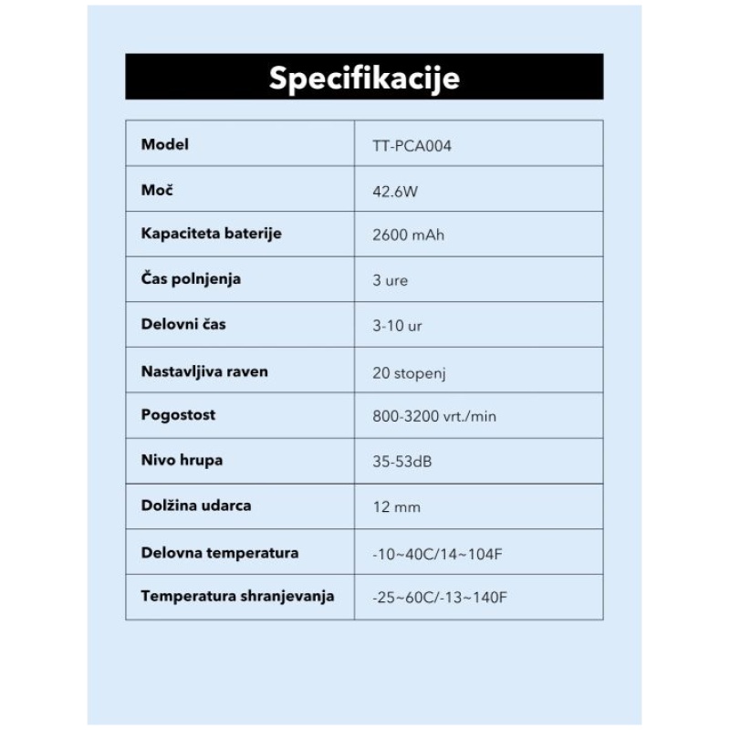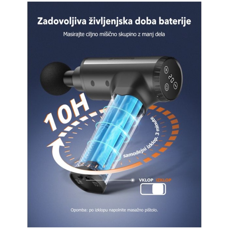 Masažna pištola deluje do 10 ur in po 3 minutah mirovanja samodejno preide v stanje spanja, po 15 minutah mirovanja pa se samodejno izklopi. S tem preprečuje neželeno pregrevanje naprave.