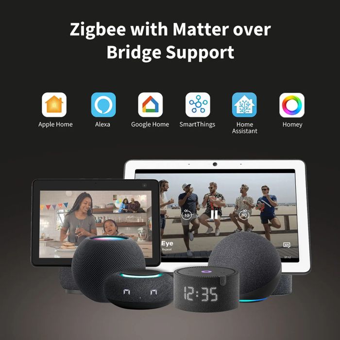 Stikalo podpira Matter over Bridge in Zigbee 3.0, kar omogoča povezavo z glavnimi ekosistemi, kot so Apple Home, Amazon Alexa, Google Home, Samsung SmartThings, Home Assistant in Homey. Kot Zigbee repetitor krepi vaš Zigbee omrežje, hkrati pa ohranja izjemno nizko porabo energije v stanju pripravljenosti – funkcija, ki jo uporabniki cenijo zaradi izboljšane povezljivosti in zmanjšanja stroškov energije.