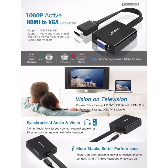 Ugreen HDMI v VGA Converter vam omogoča, da povežete svoj Notebook, prenosni računalnik, Chromebook, Rasberry Pi, HD DV s HDMI vmesnikom na projektor, LCD, TV in monitor z VGA vmesnikom za ogled velikega zaslona. Podpira ločljivost do 1920×1080 @ 60Hz in zagotavlja 3,5-milimetrski priključek za avdio linijo, ki omogoča hkratno predvajanje zvoka in videa.