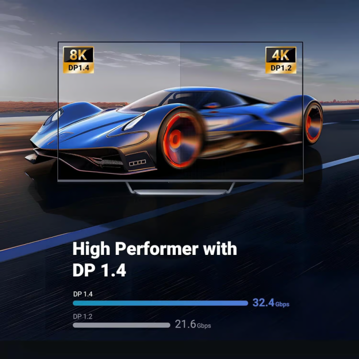 Ta kabel UGREEN 8K Displayport je uradno certificiran s strani VESA, ki podpira visoke ločljivosti 8K@60Hz, 4K@60Hz/120Hz/240Hz, 2K@120Hz/165Hz/240Hz. Podpira Dynamic HDR in HDCP 2.2. In nazaj združljiv z DisplayPort 1.3, 1.2, 1.1 in 1.0. Višja kakovost in boljša strojna oprema zahtevata boljše kable, ta kabel DisplayPort 1.4 je združljiv s priljubljeno strojno opremo 4K in prihodnjo strojno opremo 8K