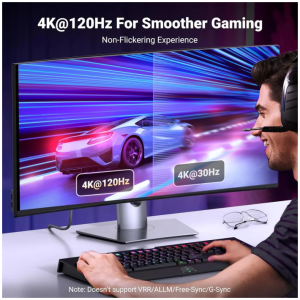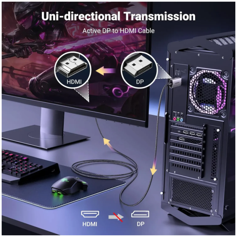 kabel UGREEN DP v HDMI vam omogoča povezavo naprav DP (npr. osebnega računalnika, prenosnika ali grafičnih kartic) na monitor, projektor, HDTV za prenos avdio in video signala. Podpira ločljivost do 8K@60Hz in visoko osvežitev (nazaj podpira 4K@120Hz), kar vam ponuja realističen 3D pogled in poglobljeno izkušnjo brez trganja. Opomba: svetujemo, da vir DP povežete neposredno z zaslonom HDMI, da se izognete napakam na zaslonu, namesto prek priklopne postaje ali zvezdišča zaradi omejitev strojne opreme