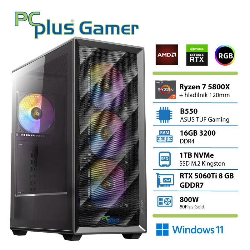 PCPLUS Gamer Ryzen 7 5800X 16GB 1TB SSD RTX 5060 Ti 8GB Windows 11 Home gaming namizni računalnik