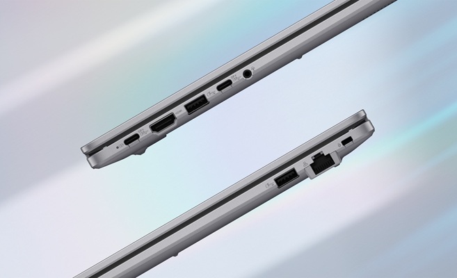 ASUS ExpertBook P1 je opremljen z obsežno linijo vrat, ki podpirajo vse vaše potrebe po povezavi. Osrednji del prilagodljivosti povezljivosti sta dva priključka USB 3.2 Gen 2 Type-C, ki nudita polno funkcionalnost s podporo za USB Power Delivery in DisplayPort. Poleg tega sta na voljo dve vrati USB 3.2 Gen 1 Type-A, tako da lahko preprosto priključite obstoječe ali starejše naprave USB. Za video izhod ima ASUS ExpertBook P1 vrata HDMI 1.4b, medtem ko so zvočne potrebe zadovoljene s 3,5 mm kombiniranim avdio priključkom. Varnost je izboljšana tudi z vključitvijo reže za ključavnico Kensington Nano, integrirana vrata RJ45 pa so pripravljena za hitro, žično omrežje.