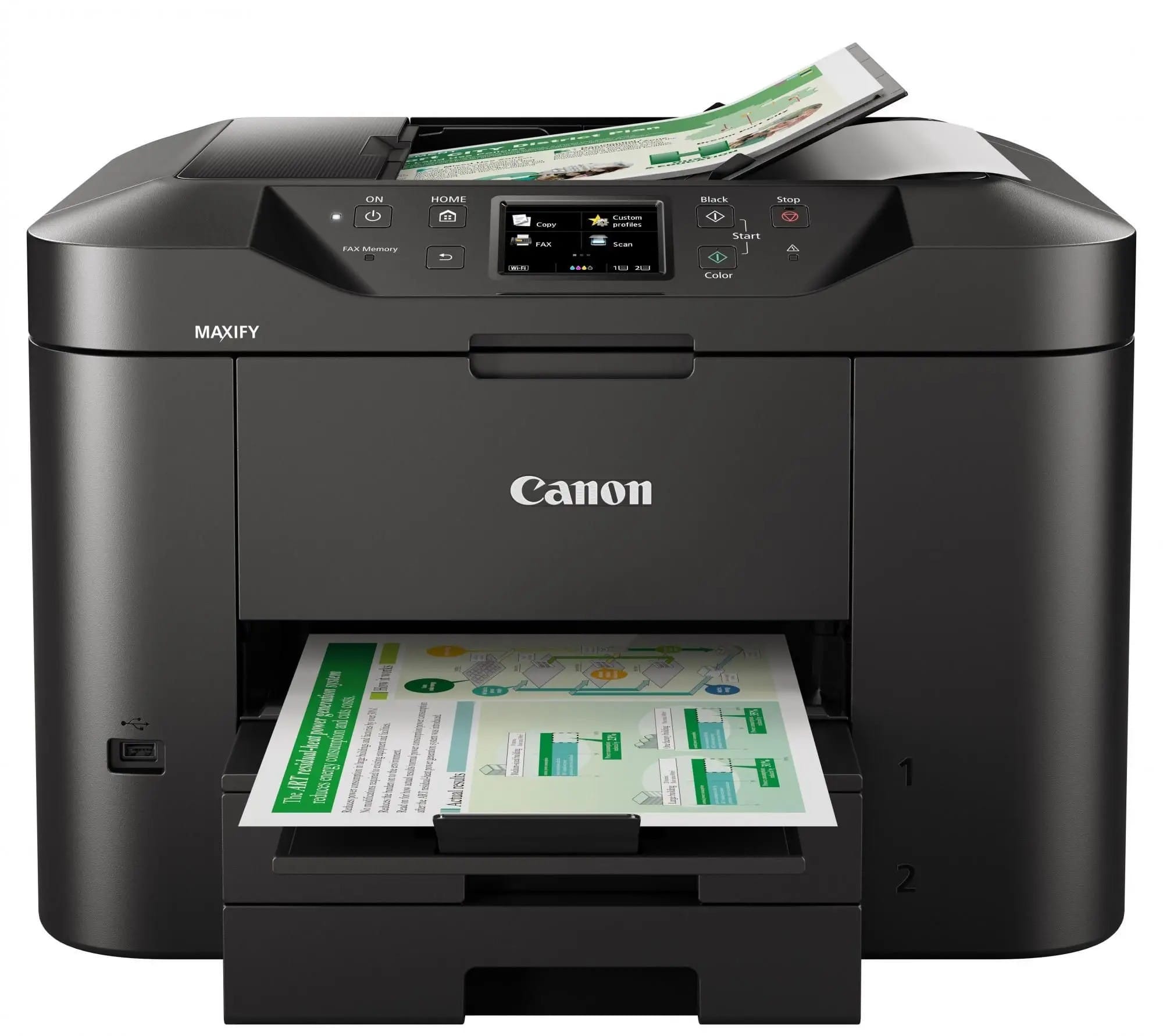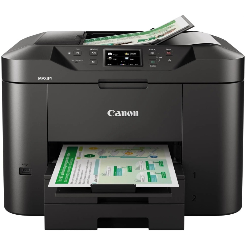 Večnamenski barvni brizgalni tiskalnik za domače pisarne. Tiskalnik Canon MAXIFY serije MB2750 omogoča mobilno tiskanje in integracijo v oblak, medtem ko s svojo 500-listno kapaciteto in hitrostjo tiskanja 24 črno-belih strani v minuti.