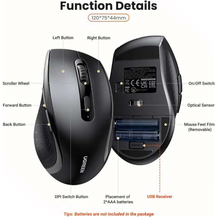 Z dvema baterijama AA (nista priloženi) lahko brezžična miška doseže 12-mesečno življenjsko dobo baterije. Poleg tega se ta tiha miška USB po 3 sekundah neaktivnosti samodejno preklopi v način mirovanja. (Baterije niso priložene!!!)