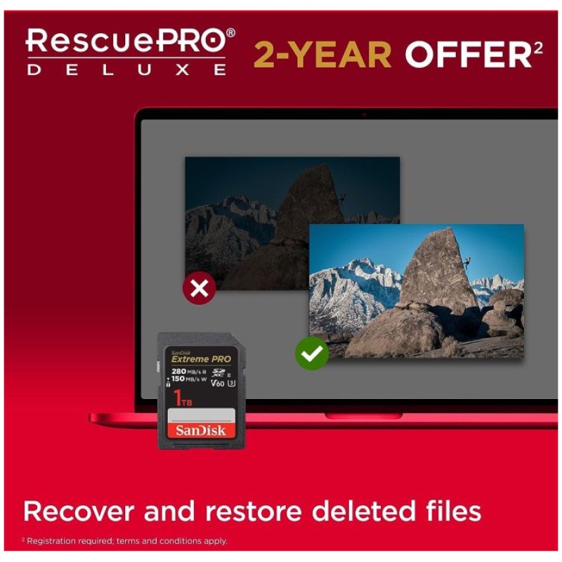 Z zanesljivimi karticami SanDisk Extreme PRO® SDXC™ UHS-II razreda 60 razreda 606 snemajte izjemen videoposnetek 6K1 ter neprekinjen zaporedni način in slike s časovnim zamikom. Shranite več vsebine visoke ločljivosti z možnostmi zmogljivosti do 1TB10 in obnovite pomotoma izbrisane datoteke z 2-letno ponudbo storitve za obnovitev datotek RescuePRO® Deluxe2.