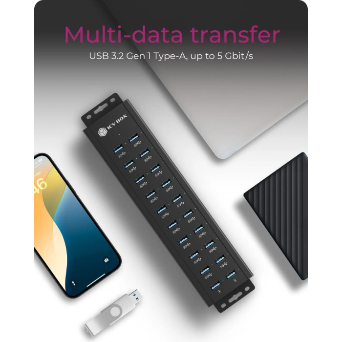 IB-HUB1720-U3 omogoča hkratno upravljanje več naprav z 18 USB Type-A priključki. Vsak priključek podpira visoke hitrosti prenosa, kar omogoča učinkovito kopiranje velikih datotek ali varnostno kopiranje podatkov zanesljivo in brez prekinitev.