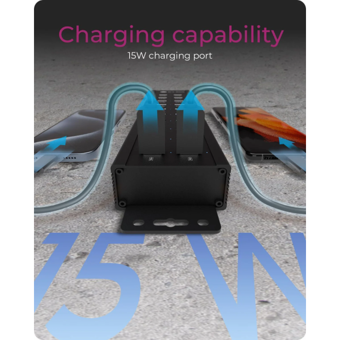 Dva namenska USB Type-A priključka omogočata hitro polnjenje naprav, kot so pametni telefoni, tablice ali druge USB naprave. Kombinacija prenosa podatkov in polnjenja omogoča široko uporabnost v različnih situacijah.