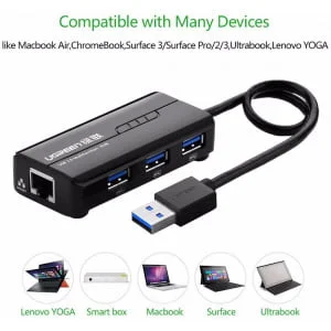 - Ugreen hub zagotavlja 3 USB 3.0 izhode, ki zagotavljajo super hiter prenos podatkov skupaj z izhodom RJ45 Gigabit Ethernet adaoterjem, ki primeren za vaš PC ali MAC računalnik. Lahko ga uporabljate tudi namesto okvarjene mrežne kartice ali namesto počasnega WiFi omrežja.